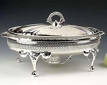 Овальная кассероль из стекла в декоративной подставке с ручками, на ножках. Встроеный держатель для свечи. Декоративная крышка с литой ручкой.
